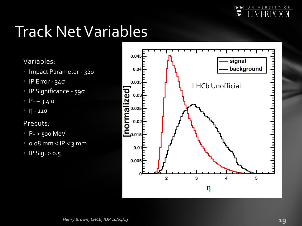 Track Net Variables • Variables: • Impact Parameter - 32σ • IP Error - 34σ • IP Significance - 59σ • PT – 3.4 σ • η - 11σ • Precuts: • PT > 500 MeV • 0.08 mm < IP < 3 mm • IP Sig. > 0.5 LHCb Unofficial Henry Brown, LHCb, IOP 10/04/13
