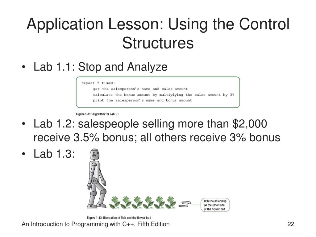 Application Lesson: Using the Control Structures • Lab 1.1: Stop and Analyze • Lab 1.2: salespeople selling more than $2,000 receive 3.5% bonus; all others receive 3% bonus • Lab 1.3: An Introduction to Programming with C++, Fifth Edition