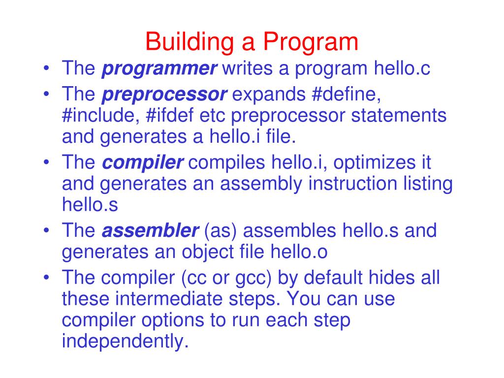 Building a Program • The programmer writes a program hello.c • The preprocessor expands #define, #include, #ifdefetc preprocessor statements and generates a hello.i file. • The compiler compiles hello.i, optimizes it and generates an assembly instruction listing hello.s • The assembler (as) assembles hello.s and generates an object file hello.o • The compiler (cc or gcc) by default hides all these intermediate steps. You can use compiler options to run each step independently.