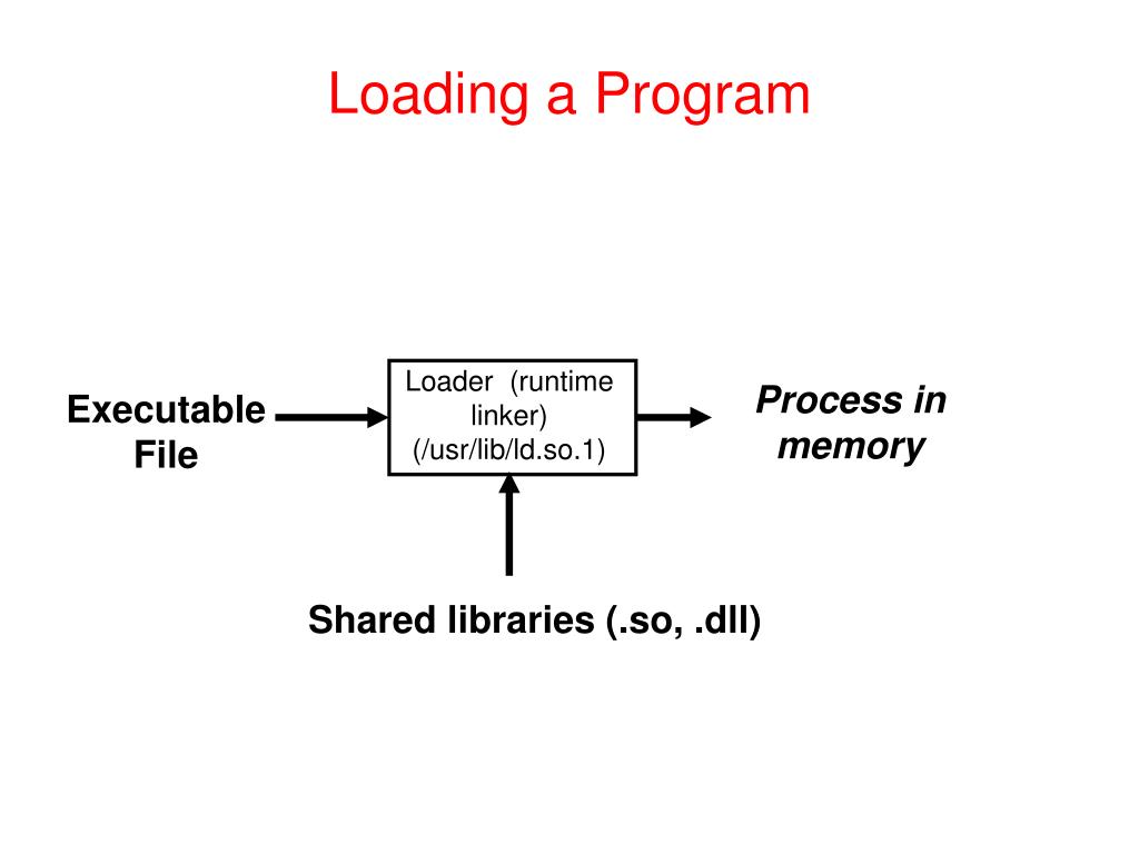 Loading a Program Loader (runtime linker) (/usr/lib/ld.so.1) Process inmemory Executable File Shared libraries (.so, .dll)