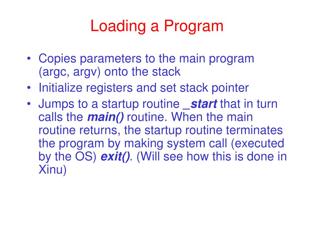 Loading a Program • Copies parameters to the main program (argc, argv) onto the stack • Initialize registers and set stack pointer • Jumps to a startup routine _start that in turn calls the main() routine. When the main routine returns, the startup routine terminates the program by making system call (executed by the OS) exit(). (Will see how this is done in Xinu)