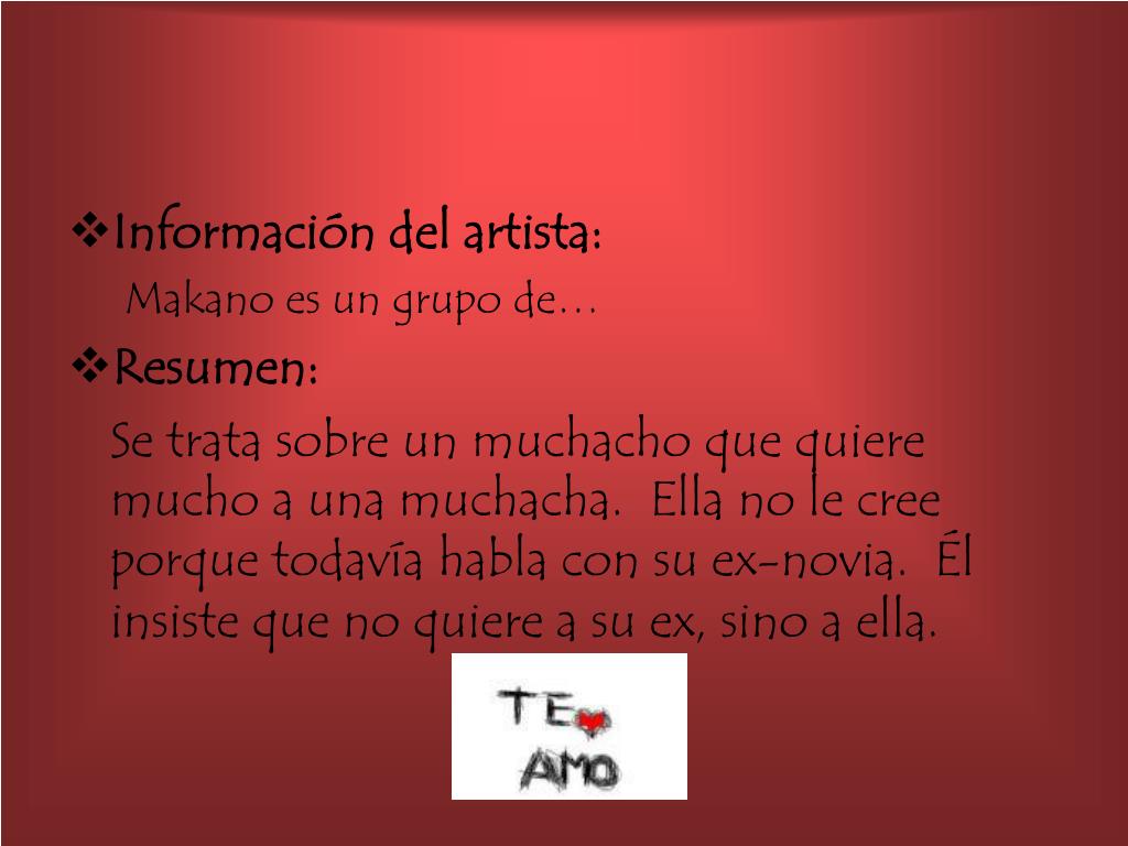 Información del artista: Makano es un grupo de… • Resumen: Se trata sobre un muchacho que quiere mucho a una muchacha. Ella no le cree porque todavía habla con su ex-novia. Él insiste que no quiere a su ex, sino a ella.
