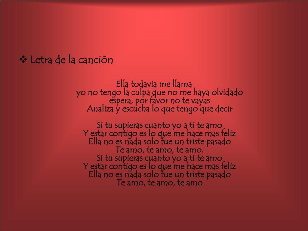 Letra de la canción Ella todavia me llamayo no tengo la culpa que no me haya olvidadoespera, por favor no te vayasAnaliza y escucha lo que tengo que decirSi tu supieras cuanto yo a ti te amoY estar contigo es lo que me hace mas felizElla no es nada solo fue un triste pasadoTe amo, te amo, te amo.Si tu supieras cuanto yo a ti te amoY estar contigo es lo que me hace mas felizElla no es nada solo fue un triste pasadoTe amo, te amo, te amo