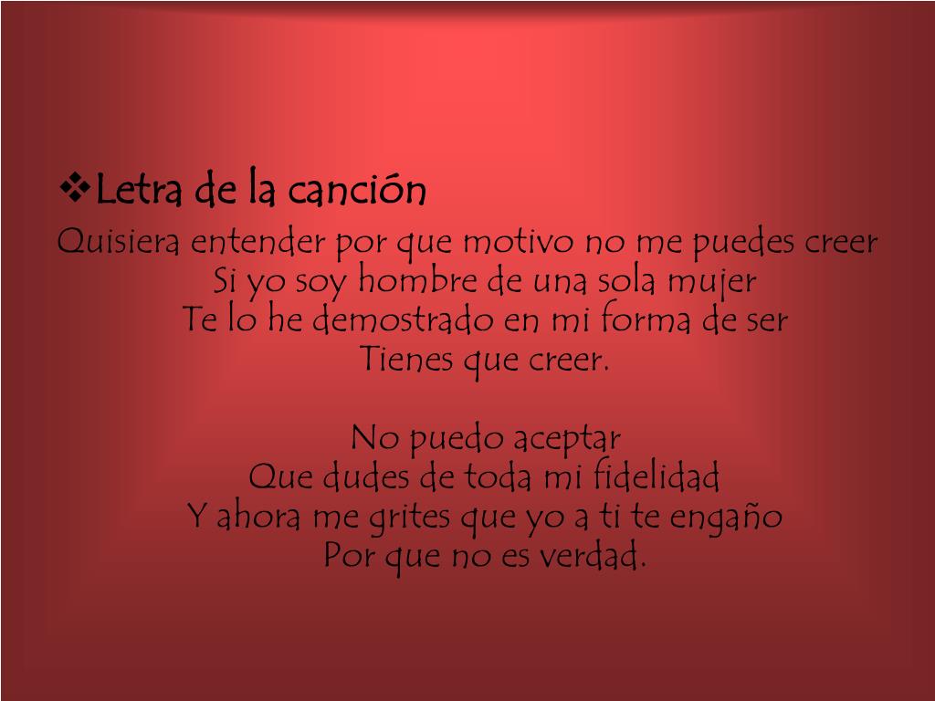 Letra de la canción Quisiera entender por que motivo no me puedes creerSi yo soy hombre de una sola mujerTe lo he demostrado en mi forma de serTienes que creer.No puedo aceptarQue dudes de toda mi fidelidadY ahora me grites que yo a ti te engañoPor que no es verdad.