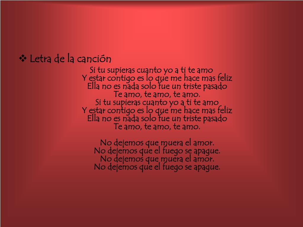 Letra de la canción Si tu supieras cuanto yo a ti te amoY estar contigo es lo que me hace mas felizElla no es nada solo fue un triste pasadoTe amo, te amo, te amo.Si tu supieras cuanto yo a ti te amoY estar contigo es lo que me hace mas felizElla no es nada solo fue un triste pasadoTe amo, te amo, te amo.No dejemos que muera el amor.No dejemos que el fuego se apague.No dejemos que muera el amor.No dejemos que el fuego se apague.