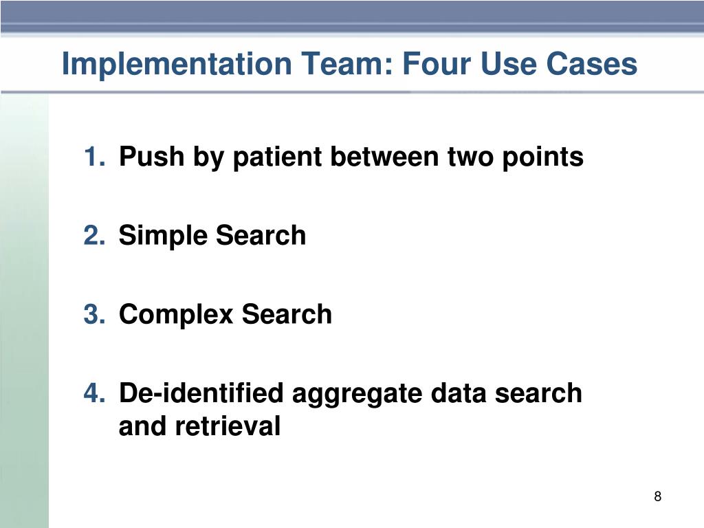 Implementation Team: Four Use Cases • Push by patient between two points • Simple Search • Complex Search • De-identified aggregate data search and retrieval 8