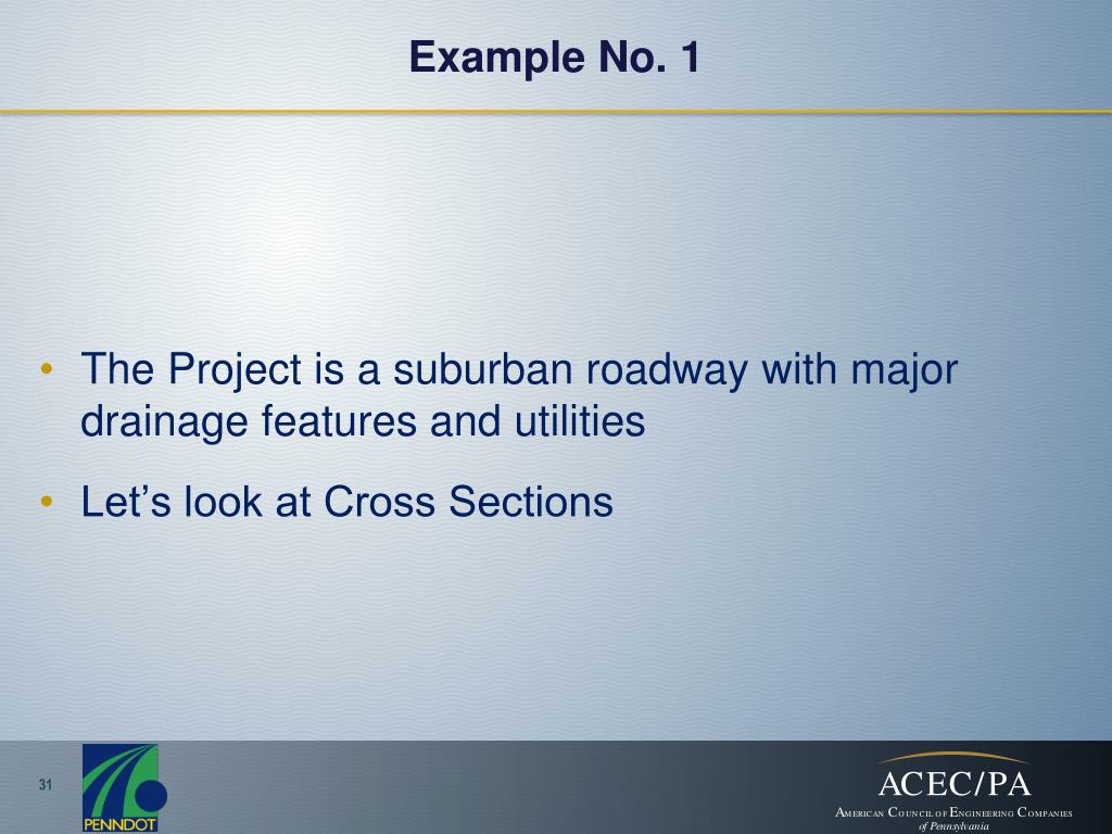 Example No. 1 The Project is a suburban roadway with major drainage features and utilities Let’s look at Cross Sections