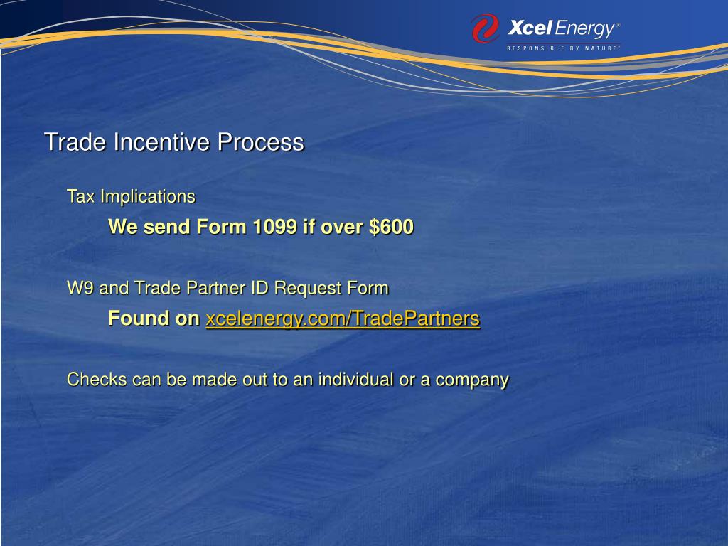 Trade Incentive Process Tax Implications We send Form 1099 if over $600 W9 and Trade Partner ID Request Form Found on xcelenergy.com/TradePartners Checks can be made out to an individual or a company