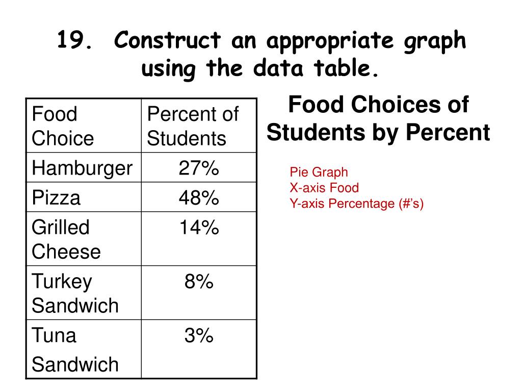 19. Construct an appropriate graph using the data table. Food Choices of Students by Percent Pie Graph X-axis Food Y-axis Percentage (#’s)