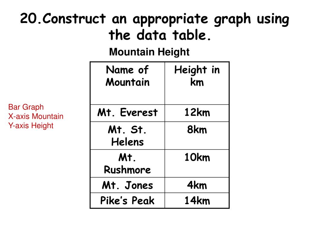 20.Construct an appropriate graph using the data table. Mountain Height Bar Graph X-axis Mountain Y-axis Height