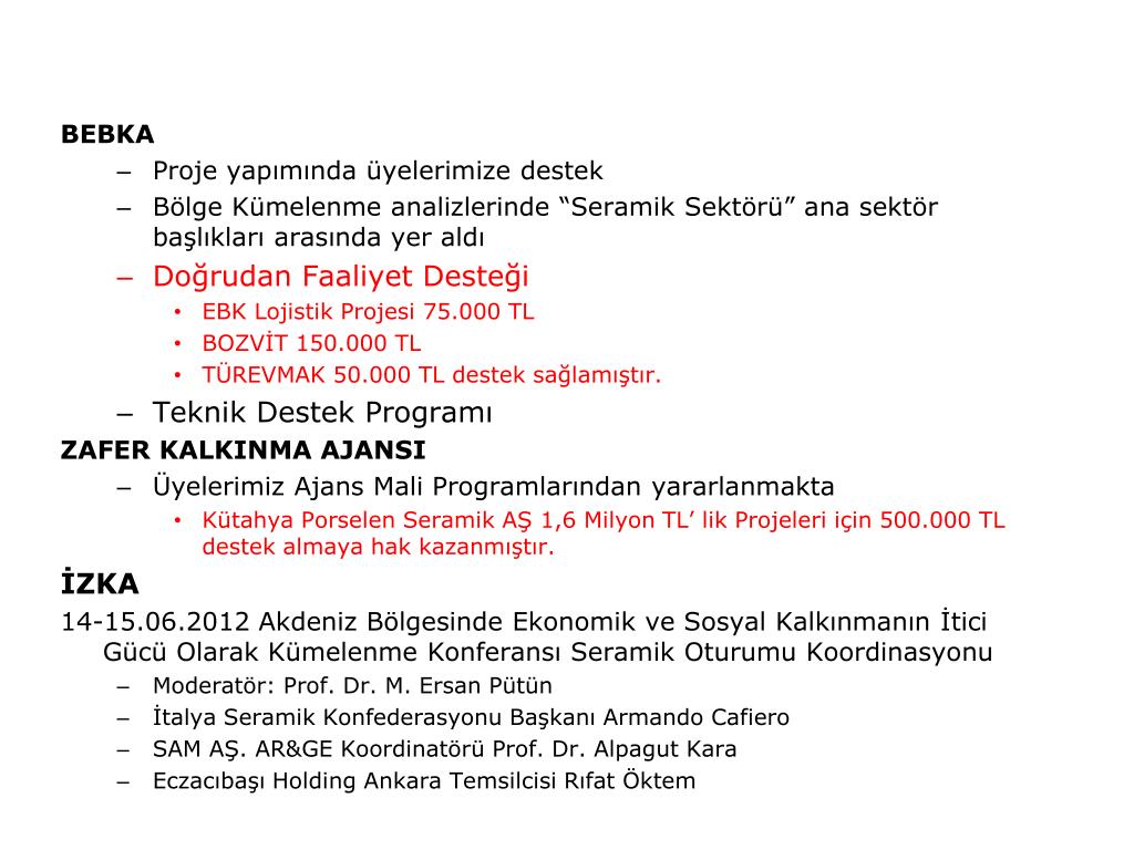 BEBKA • Proje yapımında üyelerimize destek • Bölge Kümelenme analizlerinde “Seramik Sektörü” ana sektör başlıkları arasında yer aldı • Doğrudan Faaliyet Desteği • EBK Lojistik Projesi 75.000 TL • BOZVİT 150.000 TL • TÜREVMAK 50.000 TL destek sağlamıştır. • Teknik Destek Programı ZAFER KALKINMA AJANSI • Üyelerimiz Ajans Mali Programlarından yararlanmakta • Kütahya Porselen Seramik AŞ 1,6 Milyon TL’ lik Projeleri için 500.000 TL destek almaya hak kazanmıştır. İZKA 14-15.06.2012 Akdeniz Bölgesinde Ekonomik ve Sosyal Kalkınmanın İtici Gücü Olarak Kümelenme Konferansı Seramik Oturumu Koordinasyonu • Moderatör: Prof. Dr. M. Ersan Pütün • İtalya Seramik Konfederasyonu Başkanı Armando Cafiero • SAM AŞ. AR&GE Koordinatörü Prof. Dr. Alpagut Kara • Eczacıbaşı Holding Ankara Temsilcisi Rıfat Öktem