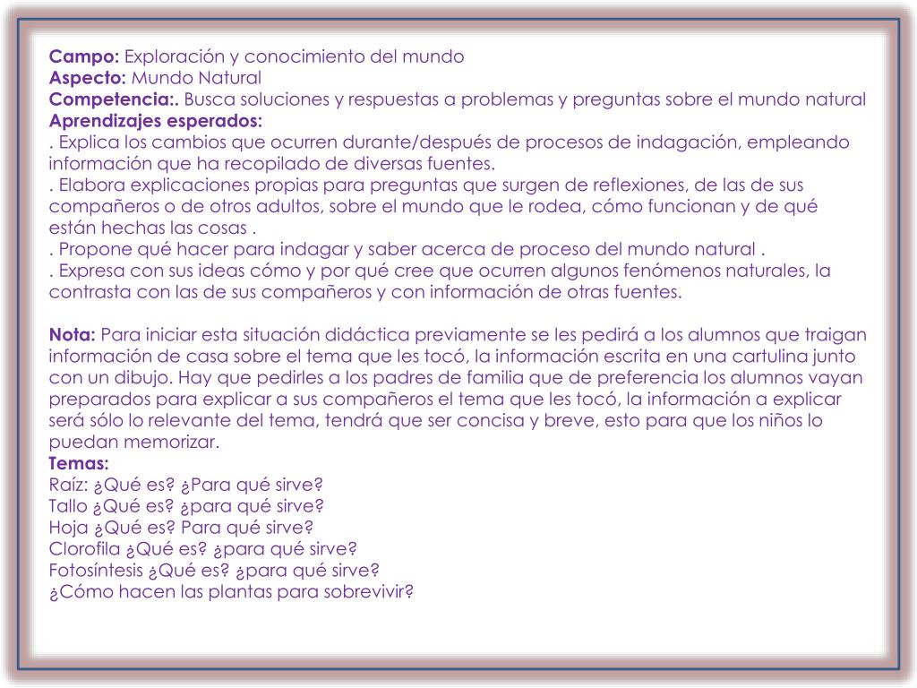 Campo: Exploración y conocimiento del mundo Aspecto: Mundo Natural Competencia:. Busca soluciones y respuestas a problemas y preguntas sobre el mundo natural Aprendizajes esperados: . Explica los cambios que ocurren durante/después de procesos de indagación, empleando información que ha recopilado de diversas fuentes. . Elabora explicaciones propias para preguntas que surgen de reflexiones, de las de sus compañeros o de otros adultos, sobre el mundo que le rodea, cómo funcionan y de qué están hechas las cosas . . Propone qué hacer para indagar y saber acerca de proceso del mundo natural . . Expresa con sus ideas cómo y por qué cree que ocurren algunos fenómenos naturales, la contrasta con las de sus compañeros y con información de otras fuentes. Nota: Para iniciar esta situación didáctica previamente se les pedirá a los alumnos que traigan información de casa sobre el tema que les tocó, la información escrita en una cartulina junto con un dibujo. Hay que pedirles a los padres de familia que de preferencia los alumnos vayan preparados para explicar a sus compañeros el tema que les tocó, la información a explicar será sólo lo relevante del tema, tendrá que ser concisa y breve, esto para que los niños lo puedan memorizar. Temas: Raíz: ¿Qué es? ¿Para qué sirve? Tallo ¿Qué es? ¿para qué sirve? Hoja ¿Qué es? Para qué sirve? Clorofila ¿Qué es? ¿para qué sirve? Fotosíntesis ¿Qué es? ¿para qué sirve? ¿Cómo hacen las plantas para sobrevivir?