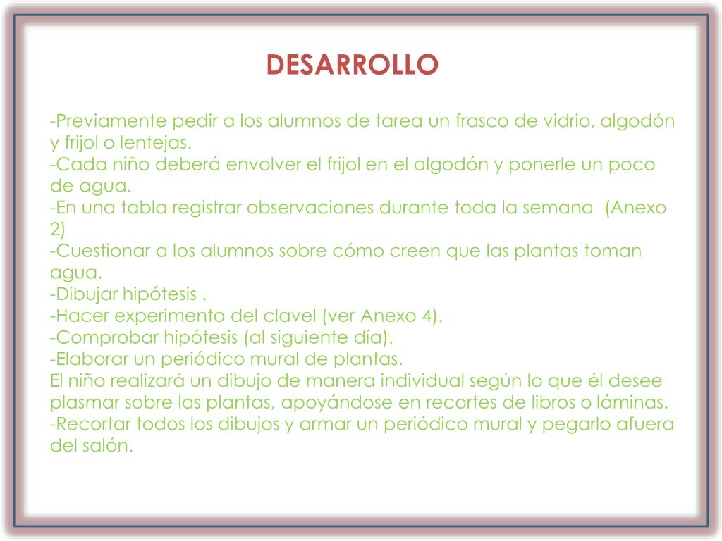 DESARROLLO • Previamente pedir a los alumnos de tarea un frasco de vidrio, algodón y frijol o lentejas. • Cada niño deberá envolver el frijol en el algodón y ponerle un poco de agua. • En una tabla registrar observaciones durante toda la semana (Anexo 2) • Cuestionar a los alumnos sobre cómo creen que las plantas toman agua. • Dibujar hipótesis . • Hacer experimento del clavel (ver Anexo 4). • Comprobar hipótesis (al siguiente día). • Elaborar un periódico mural de plantas.El niño realizará un dibujo de manera individual según lo que él desee plasmar sobre las plantas, apoyándose en recortes de libros o láminas. • Recortar todos los dibujos y armar un periódico mural y pegarlo afuera del salón.