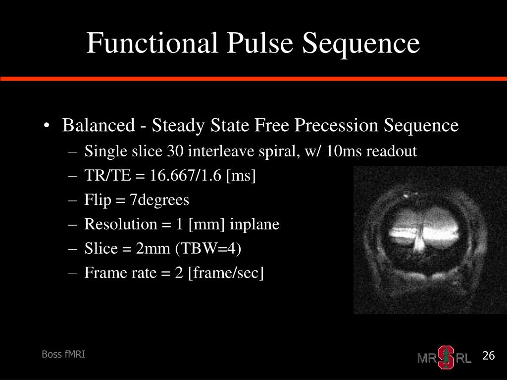 Functional Pulse Sequence • Balanced - Steady State Free Precession Sequence • Single slice 30 interleave spiral, w/ 10ms readout • TR/TE = 16.667/1.6 [ms] • Flip = 7degrees • Resolution = 1 [mm] inplane • Slice = 2mm (TBW=4) • Frame rate = 2 [frame/sec] Boss fMRI