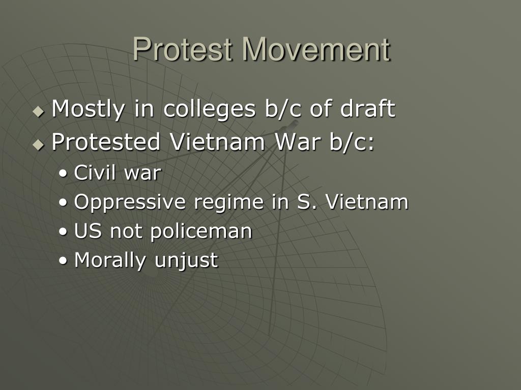 Protest Movement • Mostly in colleges b/c of draft • Protested Vietnam War b/c: • Civil war • Oppressive regime in S. Vietnam • US not policeman • Morally unjust