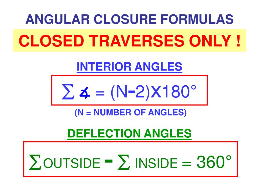 INTERIOR ANGLES ∑ ∡ = (N-2)ⅹ180° (N = NUMBER OF ANGLES) DEFLECTION ANGLES ∑OUTSIDE -∑INSIDE = 360° ANGULAR CLOSURE FORMULAS CLOSED TRAVERSES ONLY !