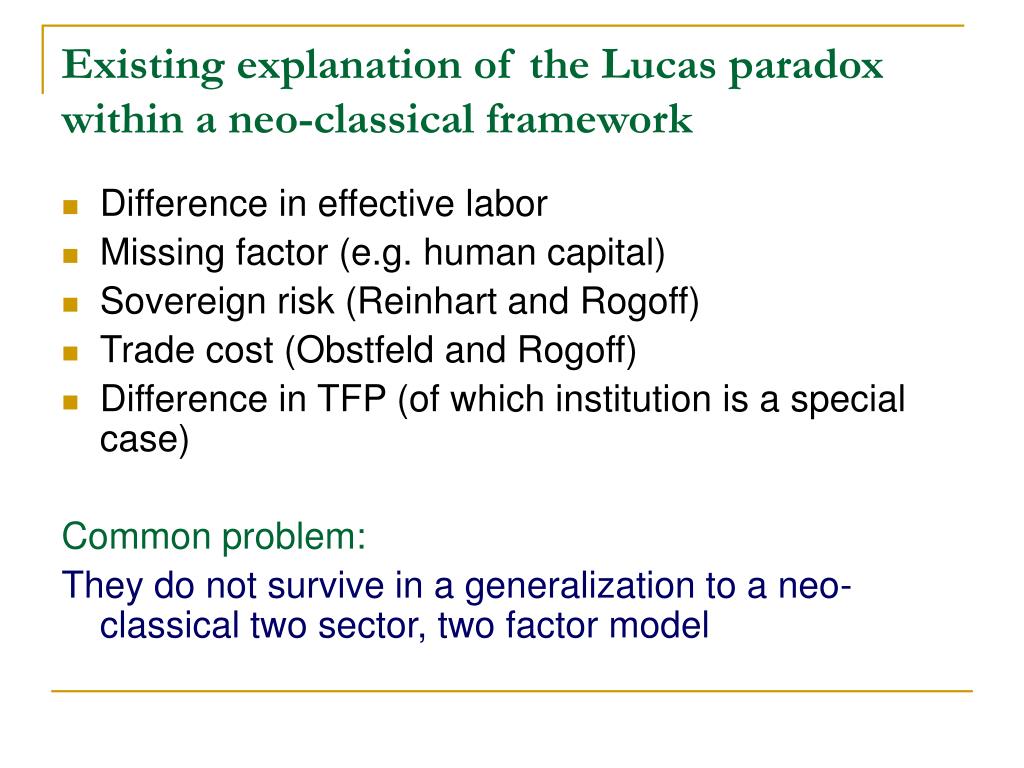 Existing explanation of the Lucas paradox within a neo-classical framework • Difference in effective labor • Missing factor (e.g. human capital) • Sovereign risk (Reinhart and Rogoff) • Trade cost (Obstfeld and Rogoff) • Difference in TFP (of which institution is a special case) Common problem: They do not survive in a generalization to a neo-classical two sector, two factor model