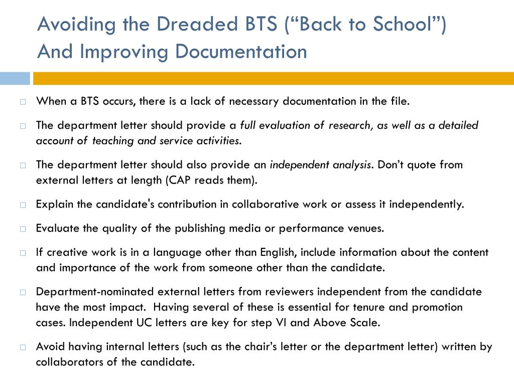 Avoiding the Dreaded BTS (“Back to School”)And Improving Documentation • When a BTS occurs, there is a lack of necessary documentation in the file. • The department letter should provide a full evaluation of research, as well as a detailed account of teaching and service activities. • The department letter should also provide an independent analysis. Don’t quote from external letters at length (CAP reads them). • Explain the candidate's contribution in collaborative work or assess it independently. • Evaluate the quality of the publishing media or performance venues. • If creative work is in a language other than English, include information about the content and importance of the work from someone other than the candidate. • Department-nominated external letters from reviewers independent from the candidate have the most impact. Having several of these is essential for tenure and promotion cases. Independent UC letters are key for step VI and Above Scale. • Avoid having internal letters (such as the chair’s letter or the department letter) written by collaborators of the candidate.