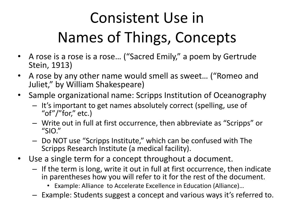 Consistent Use in Names of Things, Concepts • A rose is a rose is a rose… (“Sacred Emily,” a poem by Gertrude Stein, 1913) • A rose by any other name would smell as sweet… (“Romeo and Juliet,” by William Shakespeare) • Sample organizational name: Scripps Institution of Oceanography • It’s important to get names absolutely correct (spelling, use of “of”/”for,” etc.) • Write out in full at first occurrence, then abbreviate as “Scripps” or “SIO.” • Do NOT use “Scripps Institute,” which can be confused with The Scripps Research Institute (a medical facility). • Use a single term for a concept throughout a document. • If the term is long, write it out in full at first occurrence, then indicate in parentheses how you will refer to it for the rest of the document. • Example: Alliance to Accelerate Excellence in Education (Alliance)… • Example: Students suggest a concept and various ways it’s referred to.