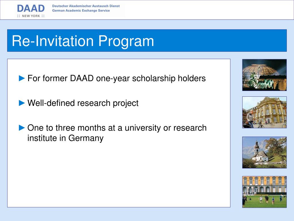 Re-Invitation Program • For former DAAD one-year scholarship holders • Well-defined research project • One to three months at a university or research institute in Germany