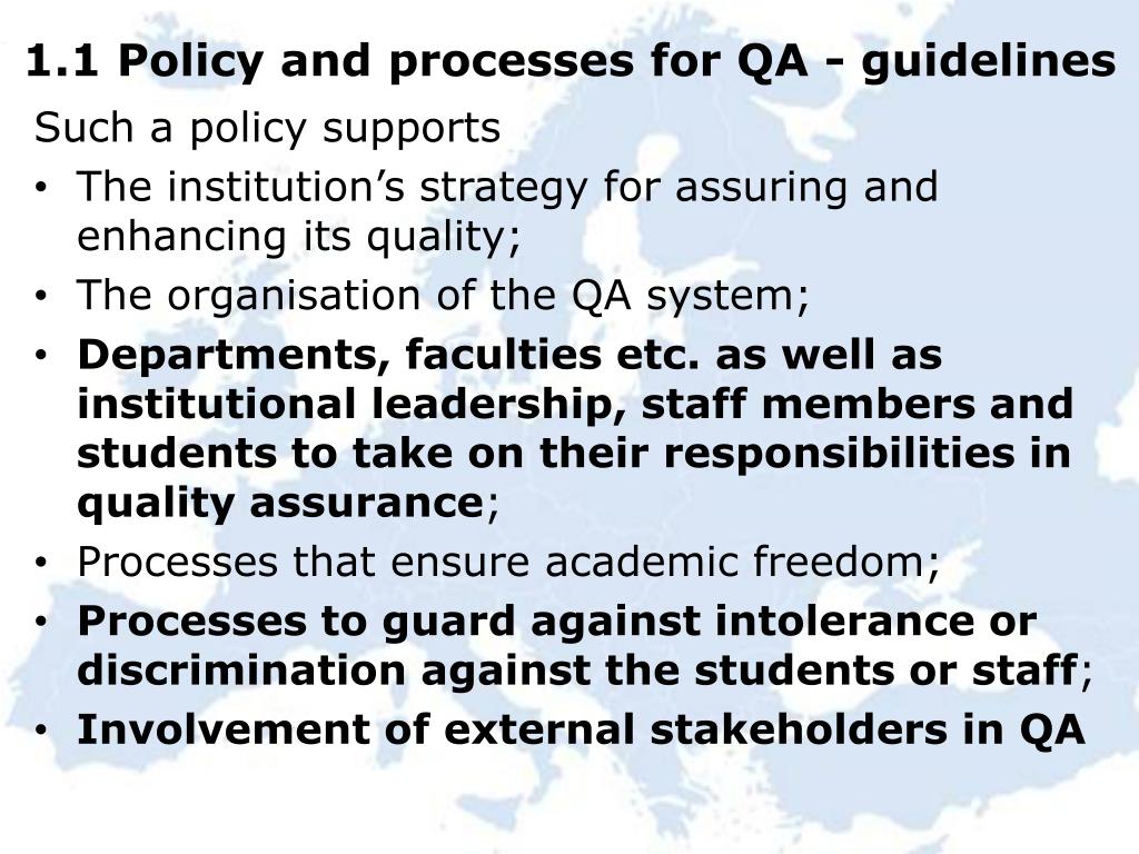 1.1 Policy and processes for QA - guidelines Such a policy supports • The institution’s strategy for assuring and enhancing its quality; • The organisation of the QA system; • Departments, faculties etc. as well as institutional leadership, staff members and students to take on their responsibilities in quality assurance; • Processes that ensure academic freedom; • Processes to guard against intolerance or discrimination against the students or staff; • Involvement of external stakeholders in QA
