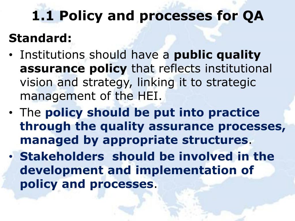 1.1 Policy and processes for QA Standard: • Institutions should have a public quality assurance policy that reflects institutional vision and strategy, linking it to strategic management of the HEI. • The policy should be put into practice through the quality assurance processes, managed by appropriate structures. • Stakeholders should be involved in the development and implementation of policy and processes.