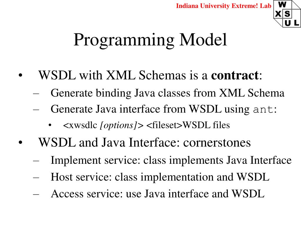 Programming Model • WSDL with XML Schemas is a contract: • Generate binding Java classes from XML Schema • Generate Java interface from WSDL using ant: • <xwsdlc [options]> <fileset>WSDL files • WSDL and Java Interface: cornerstones • Implement service: class implements Java Interface • Host service: class implementation and WSDL • Access service: use Java interface and WSDL