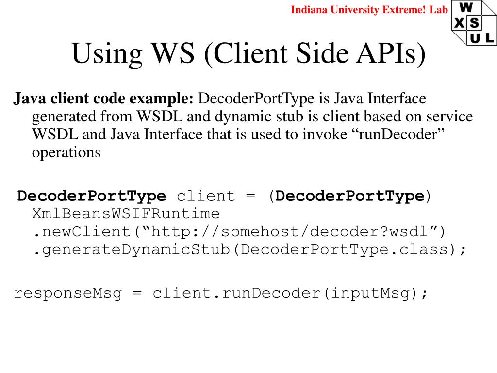 Using WS (Client Side APIs) Java client code example: DecoderPortType is Java Interface generated from WSDL and dynamic stub is client based on service WSDL and Java Interface that is used to invoke “runDecoder” operations DecoderPortType client = (DecoderPortType) XmlBeansWSIFRuntime .newClient(“http://somehost/decoder?wsdl”) .generateDynamicStub(DecoderPortType.class); responseMsg = client.runDecoder(inputMsg);
