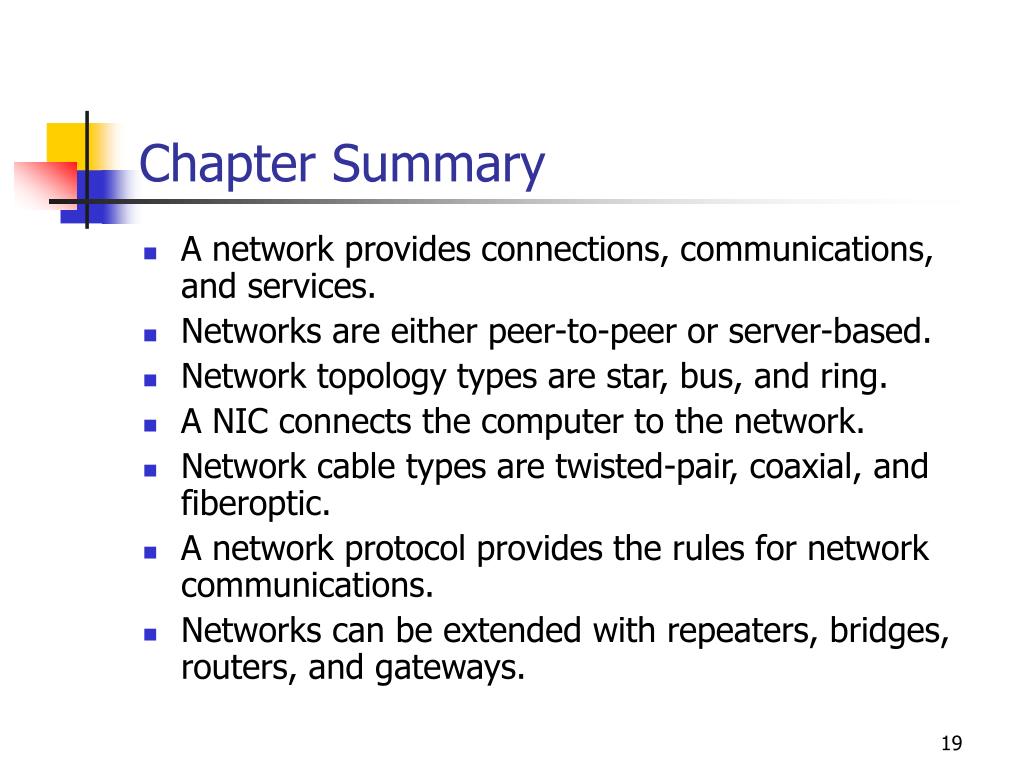 Chapter Summary • A network provides connections, communications, and services. • Networks are either peer-to-peer or server-based. • Network topology types are star, bus, and ring. • A NIC connects the computer to the network. • Network cable types are twisted-pair, coaxial, and fiberoptic. • A network protocol provides the rules for network communications. • Networks can be extended with repeaters, bridges, routers, and gateways.