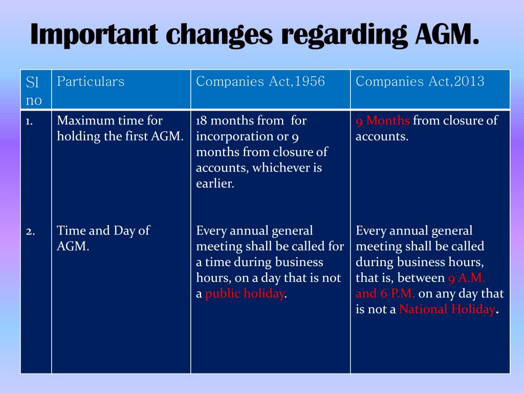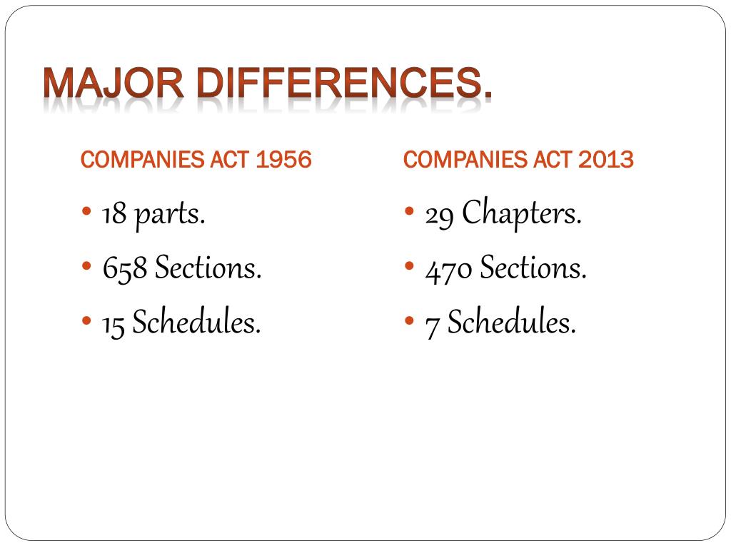 Major Differences. COMPANIES ACT 1956 COMPANIES ACT 2013 18 parts. 658 Sections. 15 Schedules. 29 Chapters. 470 Sections. 7 Schedules.
