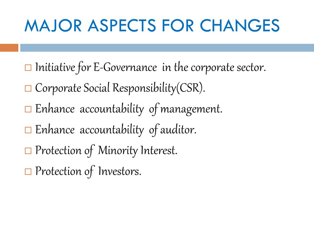 MAJOR ASPECTS FOR CHANGES • Initiative for E-Governance in the corporate sector. • Corporate Social Responsibility(CSR). • Enhance accountability of management. • Enhance accountability of auditor. • Protection of Minority Interest. • Protection of Investors.