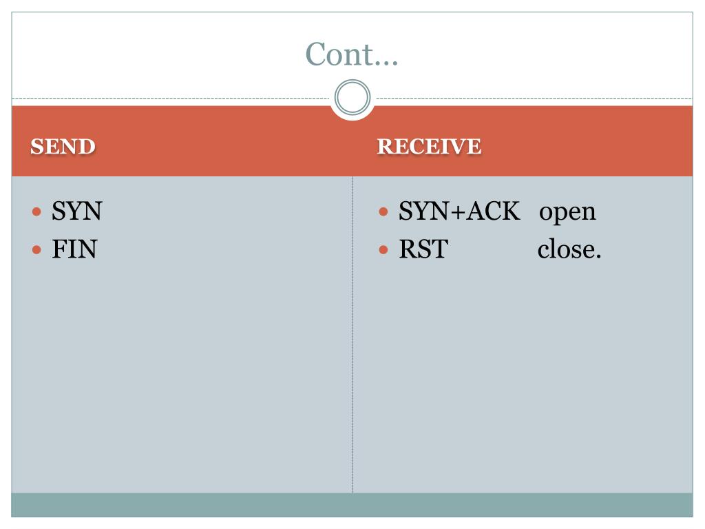 Cont… SEND RECEIVE SYN FIN SYN+ACK open RST close.