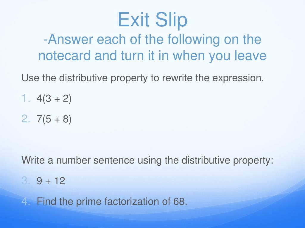 Exit Slip-Answer each of the following on the notecard and turn it in when you leave Use the distributive property to rewrite the expression. • 4(3 + 2) • 7(5 + 8) Write a number sentence using the distributive property: • 9 + 12 • Find the prime factorization of 68.