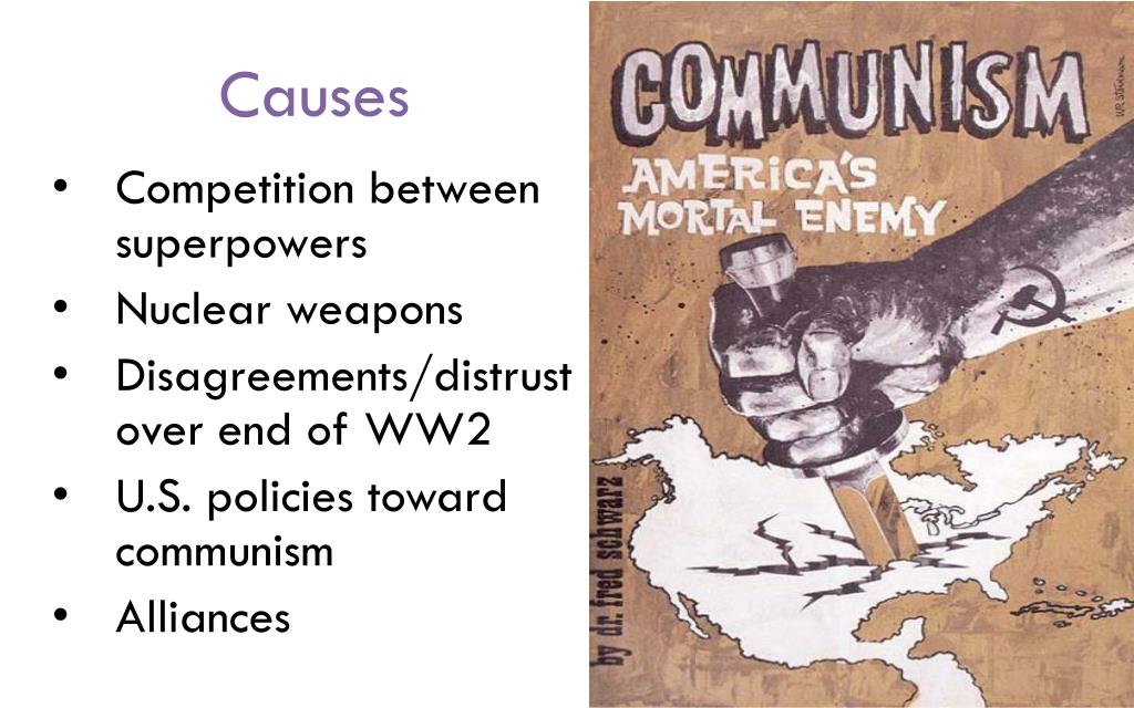 Causes • Competition between superpowers • Nuclear weapons • Disagreements/distrust over end of WW2 • U.S. policies toward communism • Alliances
