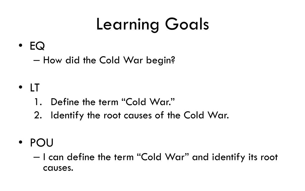 Learning Goals • EQ • How did the Cold War begin? • LT • Define the term “Cold War.” • Identify the root causes of the Cold War. • POU • I can define the term “Cold War” and identify its root causes.