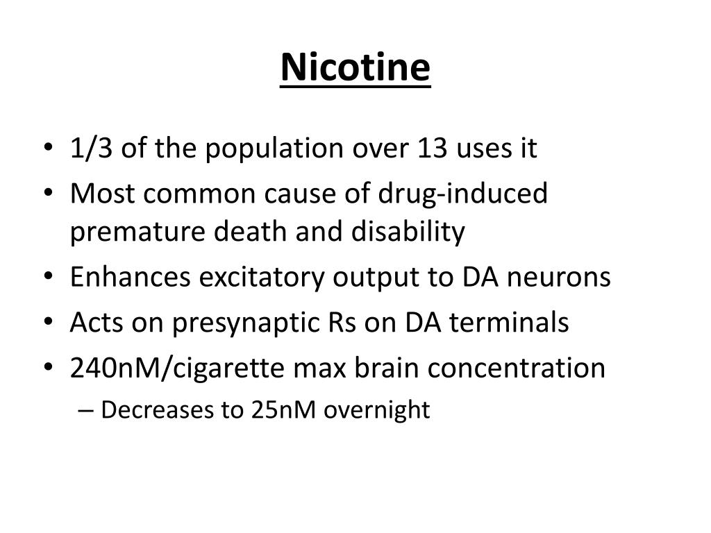 Nicotine • 1/3 of the population over 13 uses it • Most common cause of drug-induced premature death and disability • Enhances excitatory output to DA neurons • Acts on presynaptic Rs on DA terminals • 240nM/cigarette max brain concentration • Decreases to 25nM overnight