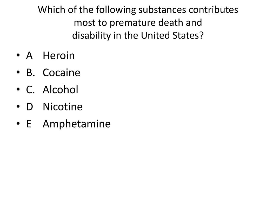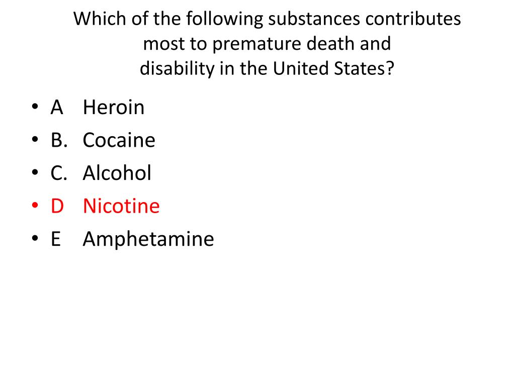 Which of the following substances contributes most to premature death anddisability in the United States? • A Heroin • B. Cocaine • C. Alcohol • D Nicotine • E Amphetamine