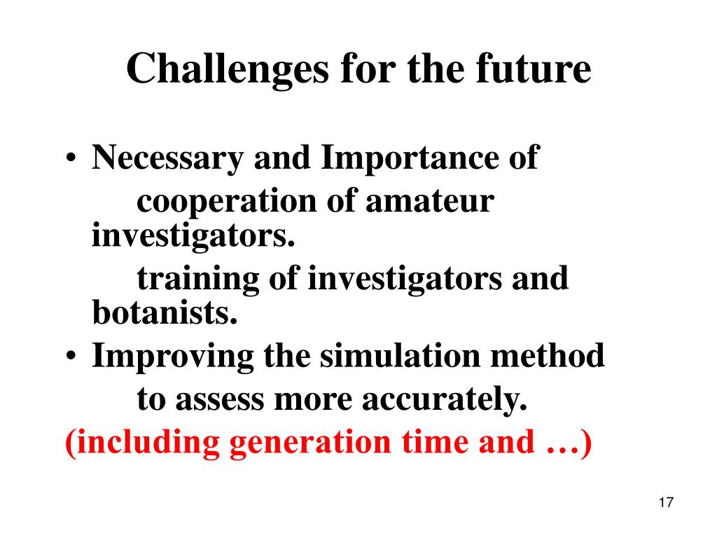 Challenges for the future Necessary and Importance of cooperation of amateur investigators. training of investigators and botanists. Improving the simulation method to assess more accurately. (including generation time and …)