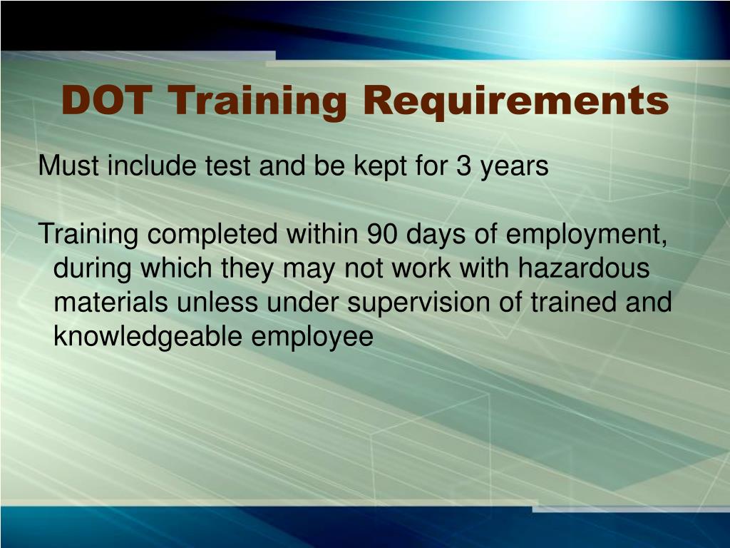 Must include test and be kept for 3 yearsTraining completed within 90 days of employment, during which they may not work with hazardous materials unless under supervision of trained and knowledgeable employee DOT Training Requirements