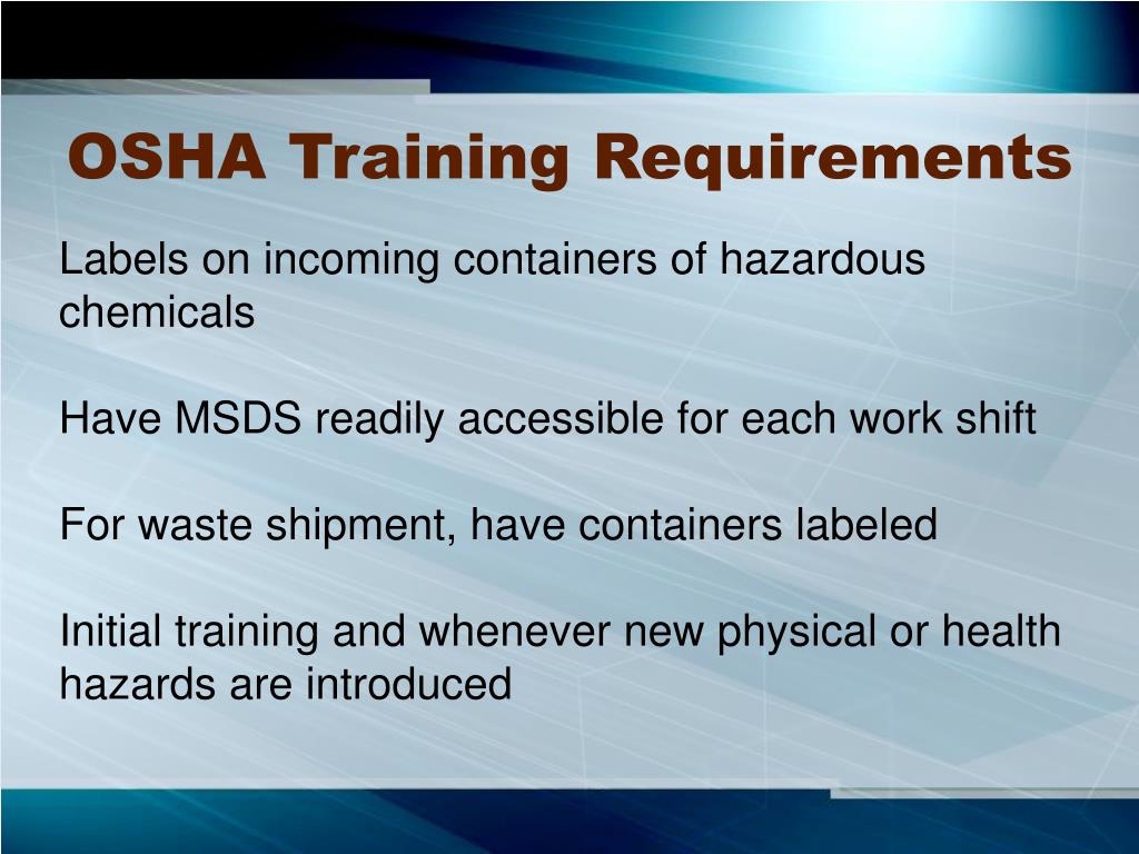OSHA Training Requirements Labels on incoming containers of hazardous chemicalsHave MSDS readily accessible for each work shiftFor waste shipment, have containers labeledInitial training and whenever new physical or health hazards are introduced