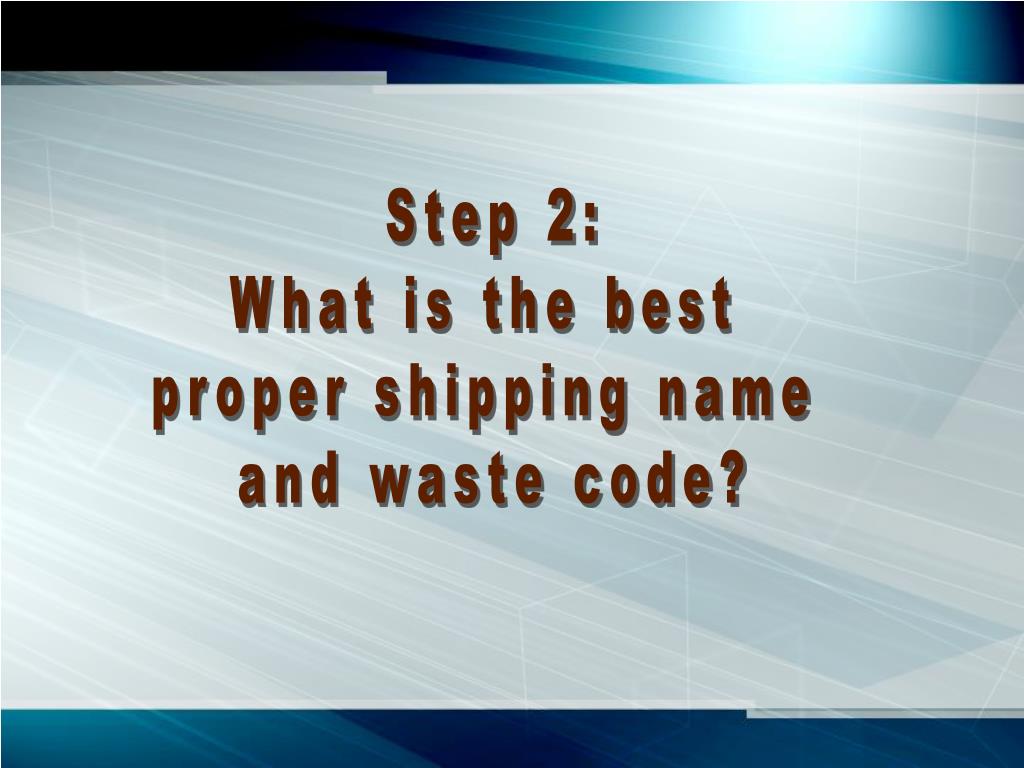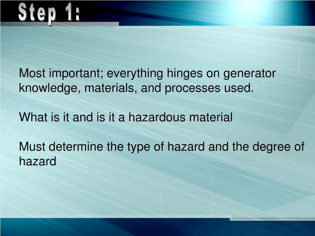 Step 1: Most important; everything hinges on generator knowledge, materials, and processes used. What is it and is it a hazardous materialMust determine the type of hazard and the degree of hazard
