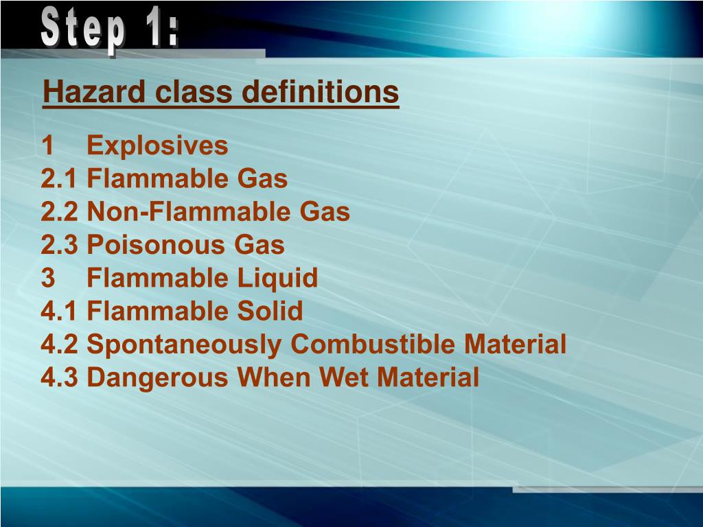 Step 1: Hazard class definitions 1 Explosives 2.1 Flammable Gas 2.2 Non-Flammable Gas 2.3 Poisonous Gas 3 Flammable Liquid 4.1 Flammable Solid 4.2 Spontaneously Combustible Material 4.3 Dangerous When Wet Material