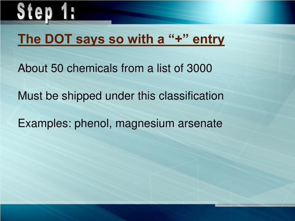 Step 1: The DOT says so with a “+” entryAbout 50 chemicals from a list of 3000Must be shipped under this classificationExamples: phenol, magnesium arsenate