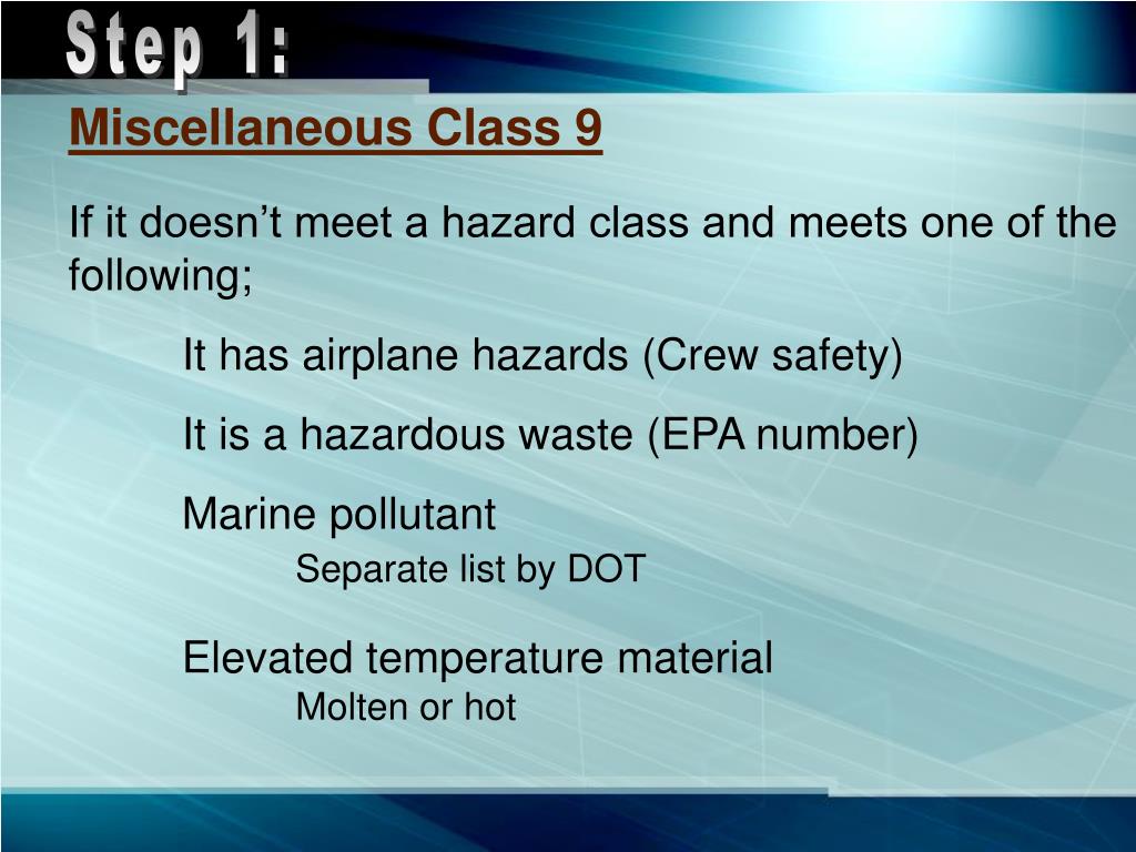 Step 1: Miscellaneous Class 9If it doesn’t meet a hazard class and meets one of the following;It has airplane hazards (Crew safety)It is a hazardous waste (EPA number)Marine pollutantSeparate list by DOTElevated temperature material Molten or hot