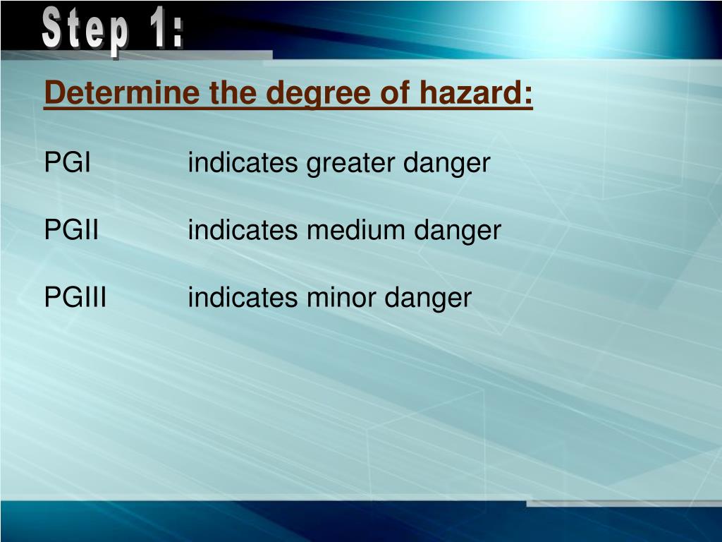 Step 1: Determine the degree of hazard:PGI indicates greater dangerPGII indicates medium dangerPGIII indicates minor danger