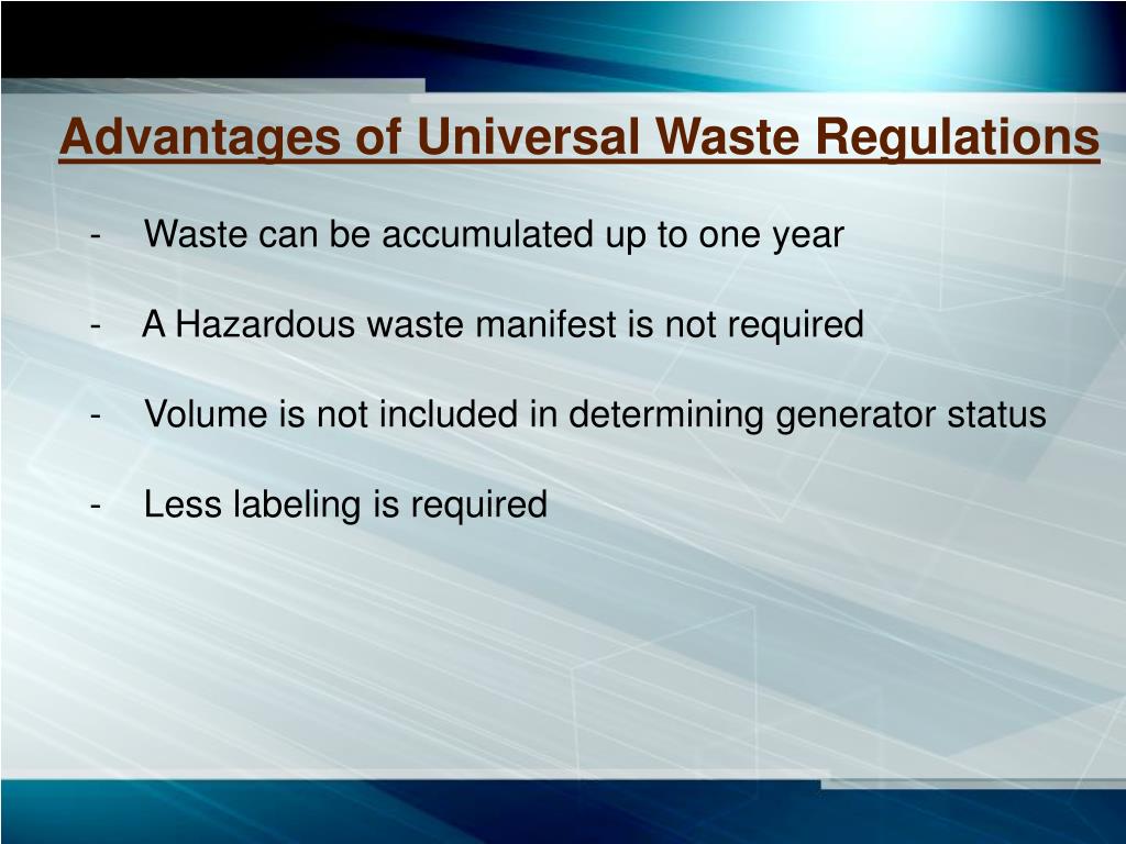 Advantages of Universal Waste Regulations - Waste can be accumulated up to one year - A Hazardous waste manifest is not required - Volume is not included in determining generator status - Less labeling is required