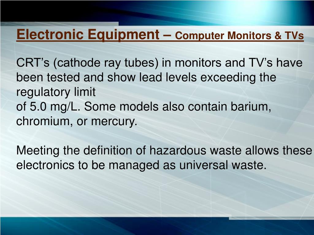 Electronic Equipment – Computer Monitors & TVsCRT’s (cathode ray tubes) in monitors and TV’s have been tested and show lead levels exceeding the regulatory limit of 5.0 mg/L. Some models also contain barium, chromium, or mercury. Meeting the definition of hazardous waste allows these electronics to be managed as universal waste.