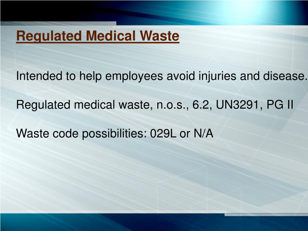 Regulated Medical WasteIntended to help employees avoid injuries and disease. Regulated medical waste, n.o.s., 6.2, UN3291, PG IIWaste code possibilities: 029L or N/A