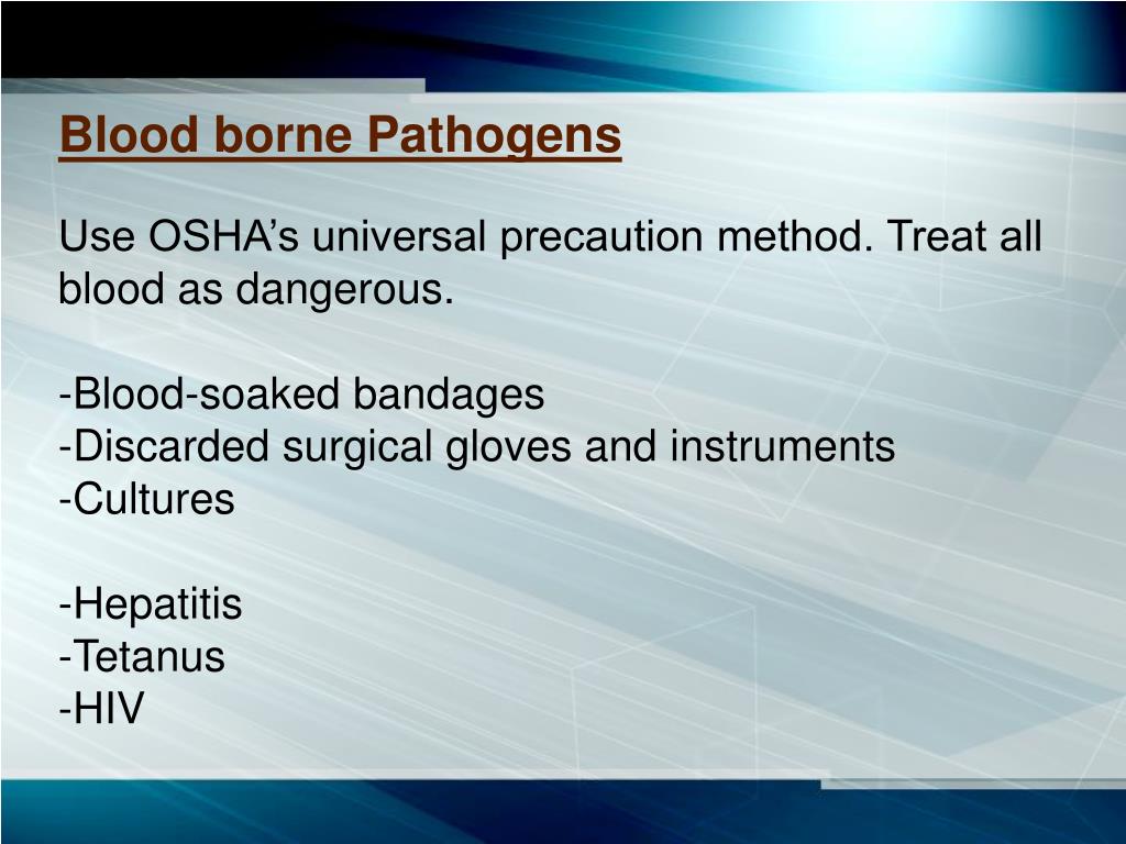 Blood borne PathogensUse OSHA’s universal precaution method. Treat all blood as dangerous. -Blood-soaked bandages-Discarded surgical gloves and instruments -Cultures-Hepatitis-Tetanus-HIV