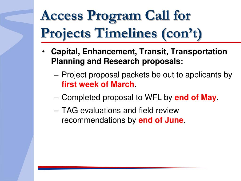Access Program Call for Projects Timelines (con’t) • Capital, Enhancement, Transit, Transportation Planning and Research proposals: • Project proposal packets be out to applicants by first week of March. • Completed proposal to WFL by end of May. • TAG evaluations and field review recommendations by end of June.